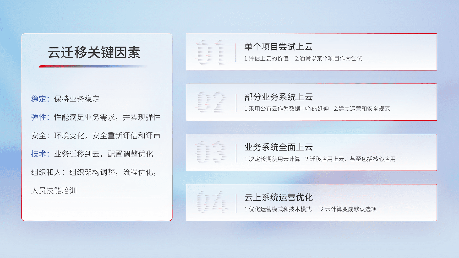 结合实际业务,,,,从规划设计、、云平台选型、、云原生改造、、、数据迁移、、集成交付,,,,迁移全过程为客户识别最佳上云路径,,,,做好风险识别管理,,,设计网络架构、、、、身份权限、、安全审计合规、、、操作审计、、日志审计、、、、监控告警策略、、、、多站点容灾设计等,,,,对云上基础设施进行整体规划,,提升IT治理水平,,,以满足弹性、、高可用、、、高性能的需求。。。。