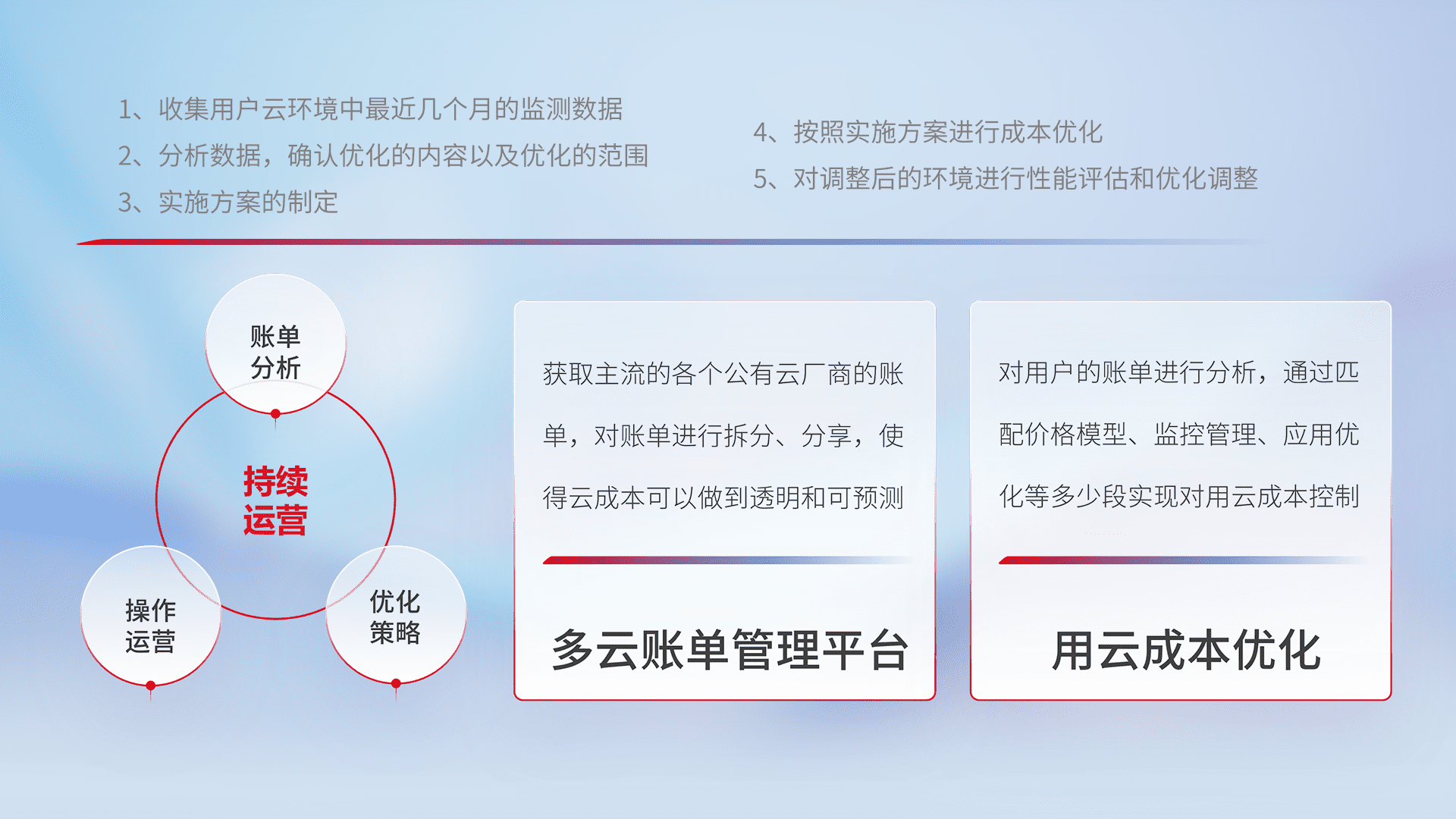 通过多云纳管,,,以统一的资源数据模型把客户的云资源进行抽象和封装,,,进而实现对多云资源的统一操作,,保障云资源管理的可靠性、、、、稳定性与可用性。。。量身定制化运维内容,,,,配置、、、、开发运维、、、补丁管理、、、、备份、、、、监控、、、认证和访问管理、、、审计和日常巡检等,,,,保障在用云过程中的可靠度,,,,稳定度以及高可用率。。。