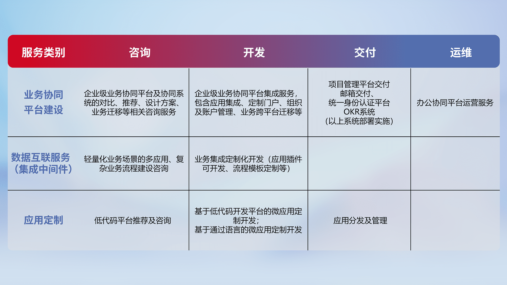 针对钉钉、、、、企微、、、、IDaas等平台级产品提供产品的规划、、、方案、、交付、、定制化开发等服务,,,实现如统一协同办公、、、、智能客户服务、、、混合会议管理、、智能数据查询、、、等业务场景,,实现数字化转型。。